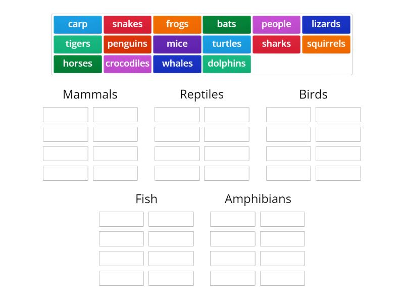 Mammals: horses, tigers, squirrels, mice, bats, whales, dolphins, people, Reptiles: snakes, lizards, crocodiles, turtles, Birds: penguins, Fish: sharks, carp, Amphibians: frogs,