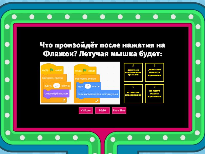 1) Команды внутри блока "повторять всегда" выполняются: a) один раз b) всегда c) все сразу d) не повторяются 2) Красный круг в Scratch обозначает a) Старт b) Стоп c) Ничего d) Финиш 3) Какой скрипт заставит исполнителя пройти ровно 10 шагов?  a) ни один скрипт b) первый (левый) скрипт c) второй (правый) скрипт d) оба скрипта 4) Блок движения  a) b) c) d) 5) Сцена в Scratch это ? a) место, где происходят события b) место где танцуют дети c) ячейка памяти 6) Как называется персонаж в программе Scratch? a) СПРУТ b) СПРАЙТ c) СКРЕТЧ d) СКРИПТ 7) К какой группе относится команда? a) Сенсоры b) Движение c) Внешность d) Управление 8) Какой их этих скриптов будет выполняться дольше других? a) там где повторяется 10 раз b) там где повторяется 5 раз c) там где повторяется 12 раз 9) Зачем спрайту нужны костюмы? a) Для создания анимации b) Для красоты c) Чтоб не замёрзнуть 10) Что произойдёт после нажатия на Флажок? Летучая мышка будет: a) двигаться с неподвижными крыльями b) двигаться и махать крыльями c) оставаться неподвижной d) на месте махать крыльями 11) Можно ли вставить песню, скачанную из Интернета, в качестве звука в программу? a) Да, предварительно записав её через микрофон b) Да c) Нет 12) Какой группы блоков нет в программе? a) Движение b) Транспорт c) Внешность d) Сенсоры e) Переменные 13) Можно ли с помощью Scratch cоздавать игры? a) Да b) Нет 14) Сколько исполнителей (спрайтов) может быть в программе? a) 1 b) 2 c) очень много 15) Данный программный блок используется для того a) Чтобы спрайт не убежал за пределы сцены b) Чтобы спрайт исчез c) Чтобы спрайт начал двигаться 16) Данный блок относится к набору блоков a) Движение b) Внешний вид c) Управление d) События 17) Данный блок относится к набору блоков a) Движение b) Внешний вид c) Управление d) События 18) Для чего используется данный блок? a) Чтобы спрайт прошел 10 шагов вперёд b) Чтобы спрайт сменил костюм c) Чтобы спрайт воспроизвел звук 19) Какой из режимов необходимо выбрать, чтобы кот превратился в армию котов? a) Мозайка b) Рыбий глаз c) Укрупнение пикселей 20) Какое направление скрывается под знаком вопроса? a) 0 b) 90 c) -90 d) 180