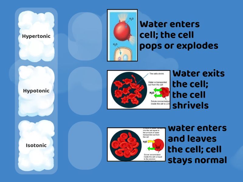 Hypertonic - Water exits the cell; the cell shrivels, Hypotonic - Water enters cell; the cell pops or explodes, Isotonic - water enters and leaves the cell; cell stays normal,