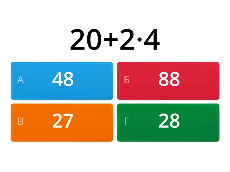 1) 20+2·4 a) 48 b) 88 c) 27 d) 28 2) 30+10:10 a) 31 b) 4 c) 1 d) 29 3) 27:3+4 a) 10 b) 12 c) 13 d) 27 4) 30 : 6 · 2 a) 11 b) 10 c) 24 d) 56 5) 20-6·2 a) 8 b) 10 c) 28 d) 6 6) 16: 8 + 100 a) 100 b) 103 c) 102 d) 12 7) 100–18: 9 a) 99 b) 90 c) 80 d) 98 8) 5+4·10 a) 45 b) 25 c) 19 d) 15 9) 7+2·9 a) 81 b) 18 c) 25 d) 24 10) 28-8·1 a) 18 b) 8 c) 2 d) 20
