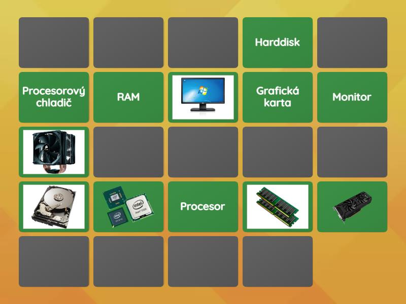 Grafická karta, Monitor, Procesor, Procesorový chladič, RAM, Harddisk, SSD, Myš, Sluchátka, Zvuková karta, Síťová karta, CD-ROM,