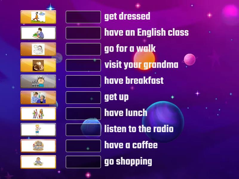 get up, get dressed, have breakfast, listen to the radio, go for a walk, have lunch, have a coffee, visit your grandma, go shopping, have an English class,