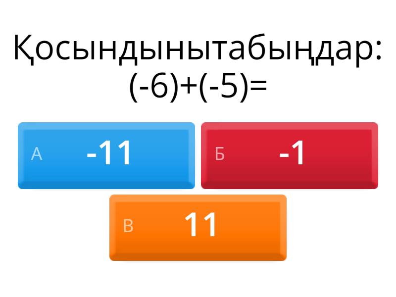 1) Қосындынытабыңдар: (-6)+(-5)= a) -11 b) -1 c) 11 2) Өрнекті ықшамдаңдар: -5а+(-3а)+(-7а)+(-5а)= a) 12а b) -20а c) -12а 3) Теңдеуді шешіңдер: х-5=-35 a) 40 b) -40 c) -30 4) 56 санының 25% табыңыз a) 22,04 b) 28 c) 20 5) Теңдеудішешіңдер : х+ (-5) =2 a) -7 b) 7 c) 5