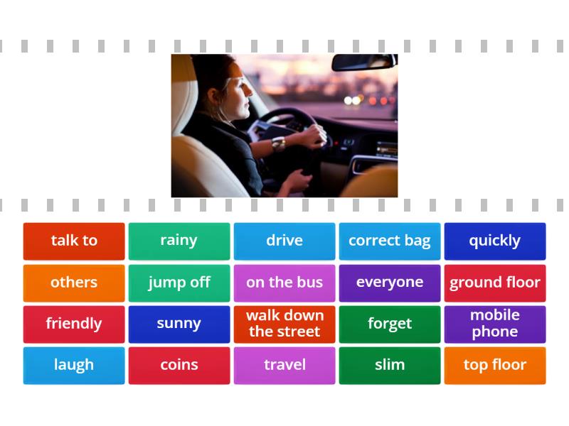 drive, ground floor, top floor, slim, travel, sunny, rainy, talk to, everyone, laugh, friendly, others - другие, forget, on the bus, quickly, jump off, walk down the street, mobile phone, correct bag, coins ,