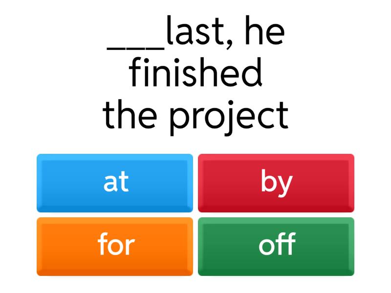 1) ___last, he finished the project  a) at b) by c) for d) off 2) ____ the wrong a) at b) in c) on d) for 3) He moved to another country ___ good a) at b) by c) for d) in 4) ___ one thing, he helped us a lot. So we must give him a hand now. a) for b) at c) by d) of 5) His career was ___ stake a) on b) for c) of d) at 6) Everything is alright ____ the time being a) on b) for c) at d) in 7) ____ the one hand he worked hard, but he didn't finish the work on time. a) in b) on c) for d) by 8) ___ second thoughts, I don't want to buy that dress a) at b) in c) on d) by 9) I was ______ the impression that he doesn't like me. Is that true> a) over b) in c) on d) under 10) I asked him to come and he came ____ once a) at b) on c) in d) for 11) There are some problems, but, ___ the whole, everything is working. a) in b) on c) at d) for 12) I will help you ____ condition that you tell me the truth a) in b) on c) at d) under 13) ___ effect, they had no choice a) in b) at c) on d) for 14) She was ___doubt whether to go to the party or not a) on b) over c) by d) in 15) with any luck, he will arrive just ___ time for the dinner a) on b) in c) by 16) She's never __ time, I can't believe how disorganised she is. a) in b) on 17) "Thanks for helping." "Not ___ all." a) in b) at c) on 18) The truck driver was ___ fault for the terrible accident. a) on b) in c) at 19) There’s enough fuel to keep us going ___ now a) for b) on c) at d) in 20) Traffic may be bad, but in ___case, we'll be there in time for dinner. a) any b) other c) that 21) I don’t need it tonight.’ ‘In _____ case, I’ll keep it until tomorrow.’ a) any b) other c) that 22) We walked on, looking in vain for a taxi. We walked on, looking ___ vain for a taxi.  a) on b) in c) by d) at
