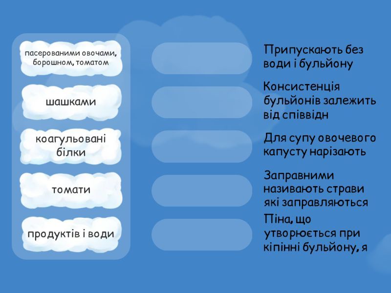 шашками - Для супу овочевого капусту нарізають, коагульовані білки - Піна, що утворюється при кіпінні бульйону, я, продуктів і води - Консистенція бульйонів залежить від співвідн, томати - Припускають без води і бульйону, пасерованими овочами, борошном, томатом - Заправними називають страви які заправляються,