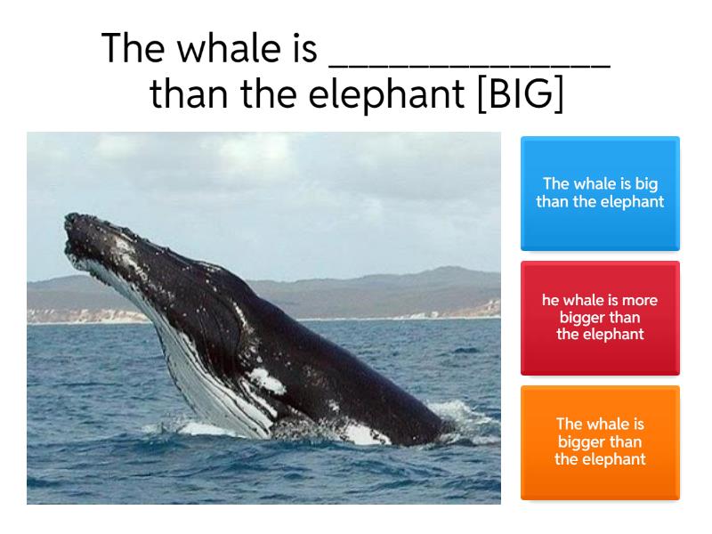 1) The whale is ______________ than the elephant [BIG] a) The whale is big than the elephant b) he whale is more bigger than the elephant c) The whale is bigger than the elephant 2) The ostrich is ___________________ than a chicken. [FAST] a) The ostrich is more fast than a chicken. b) The ostrich is faster than a chicken. c) The ostrich is fastest than a chicken. 3) The shark is ____________________ than the whale. [DANGEROUS] a) The shark is more dangerous than the whale b) The shark is dangerouser than the whale c) The shark is more dangerousser than the whale 4) The butterfly is ____________________ than the bee. [BEAUTIFUL] a) The butterfly is most beautiful than the bee. b) The butterfly is more beautiful than the bee. c) The butterfly is beautifuller than the bee. 5) The blobfish is __________ than the butterfly. [UGLY] a) The blobfish is uglier than the butterfly. b) The blobfish is more uglier than the butterfly. c) The blobfish is most uglier than the butterfly. 6) Zebras are ________ than giraffes. [SHORT] a) Zebras are shorter than giraffes. b) Zebras are more short than giraffes. c) Zebras are shortest than giraffes. 7) The blobfish is __________ in the world! a) The blobfish is very ugly in the world! b) The blobfish is ugliest in the world! c) The blobfish is the ugliest in the world! 8) The eagle is ________________ bird! [STRONG] a) The eagle is stronger bird. b) The eagle is the strongest bird c) The eagle is most strongest bird. 9) Colibri is _________________ bird in the world! [COLOURFUL] a) Colibri is the most colourful bird in the world.  b) Colibri is most colourful bird in the world. c) Colibri is the more colourful bird in the world. 10) Horses are ___________ than scorpions! [GOOD] a) Horses are more good than scorpions! b) Horses are gooder than scorpions! c) Horses are better than scorpions! 11) Scorpions are ______________ than horses. [BAD] a) Scorpions are badder than horses. b) Scorpions are worse than horses. c) Scorpions are the badder than horses.
