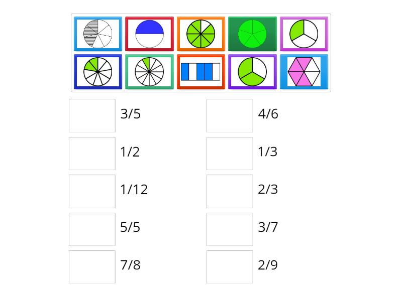 1/3, 4/6, 3/5, 7/8, 2/9, 3/7, 2/3, 1/2, 1/12, 5/5,