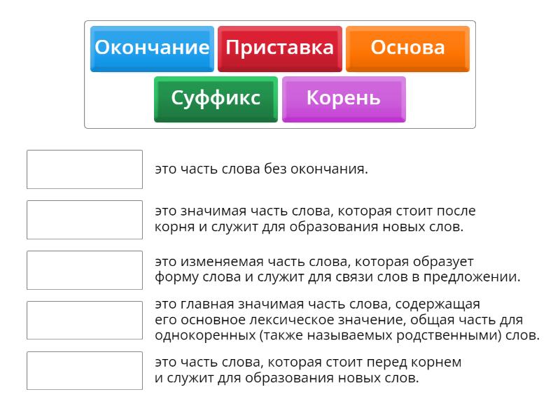 Приставка - это часть слова, которая стоит перед корнем и служит для образования новых слов., Корень - это главная значимая часть слова, содержащая его основное лексическое значение, общая часть для однокоренных (также называемых родственными) слов., Суффикс - это значимая часть слова, которая стоит после корня и служит для образования новых слов., Окончание - это изменяемая часть слова, которая образует форму слова и служит для связи слов в предложении., Основа - это часть слова без окончания.,