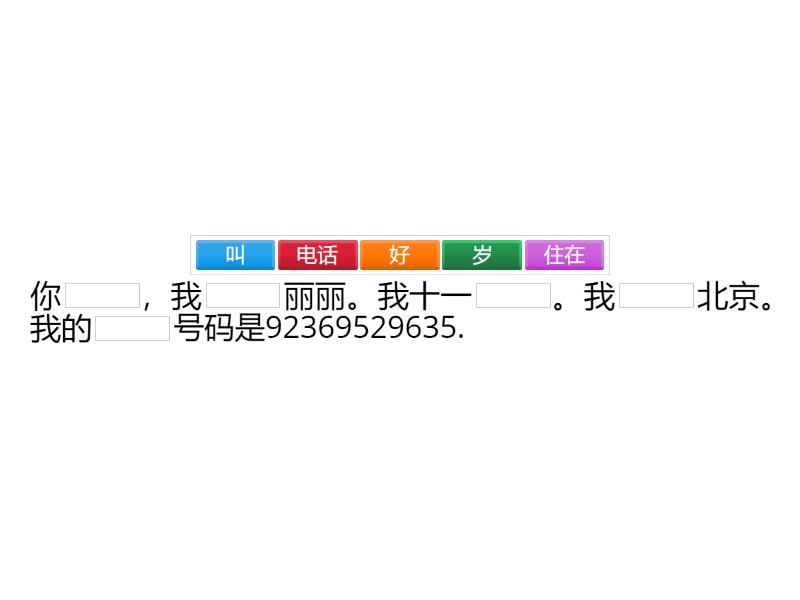 你____,我____丽丽。我十一____。我____北京。 我的____号码是92369529635. 你的生日是____月几____? 我的____是六月五号。 你的____号码是____? 我的电话____是567898797. 今天几____几号?____七月四号 今天星期____? 今天____。 我____动物。爸爸,妈妈常常____我____动物园。