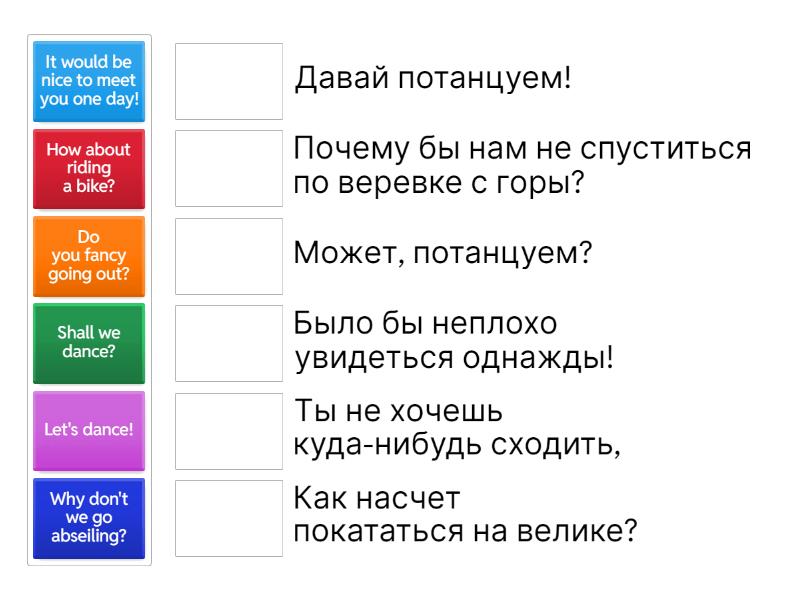 Shall we dance? - Может, потанцуем?, Let's dance! - Давай потанцуем!, Do you fancy going out? - Ты не хочешь куда-нибудь сходить,, How about riding a bike? - Как насчет покататься на велике?, It would be nice to meet you one day! - Было бы неплохо увидеться однажды!, Why don't we go abseiling? - Почему бы нам не спуститься по веревке с горы?,
