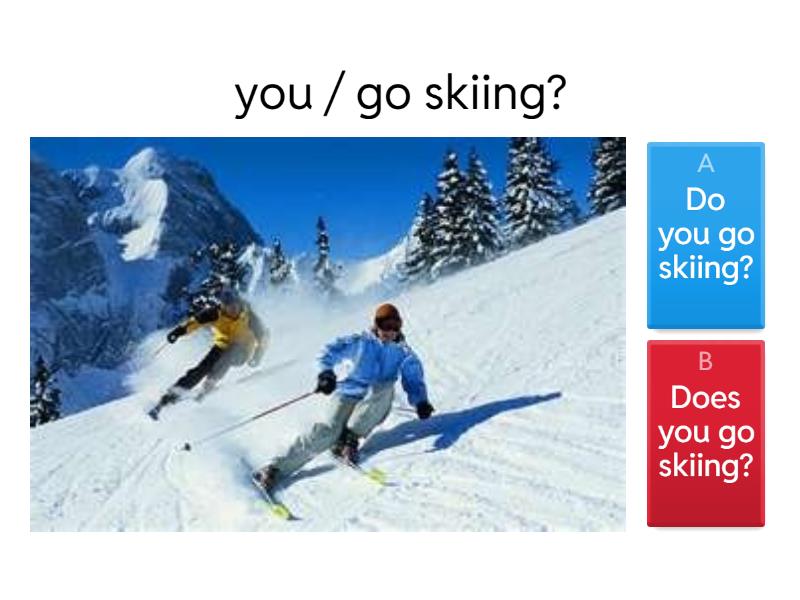 1) you / go skiing? a) Do you go skiing? b) Does you go skiing? 2) he / go swimming? a) Do he go swimming? b) Does he go swimming? 3) Amy / play the violin? a) Does Amy play the violin? b) Do Amy play the violin? 4) Peter / collect football cards? a) Do Peter collect football cards? b) Does Peter collect football cards? 5) we / watch TV a lot? a) Does we watch TV a lot? b) Do we watch TV a lot? 6) you / play a musical instrument? a) Does you play a musical instrument? b) Do you play a musical instrument?