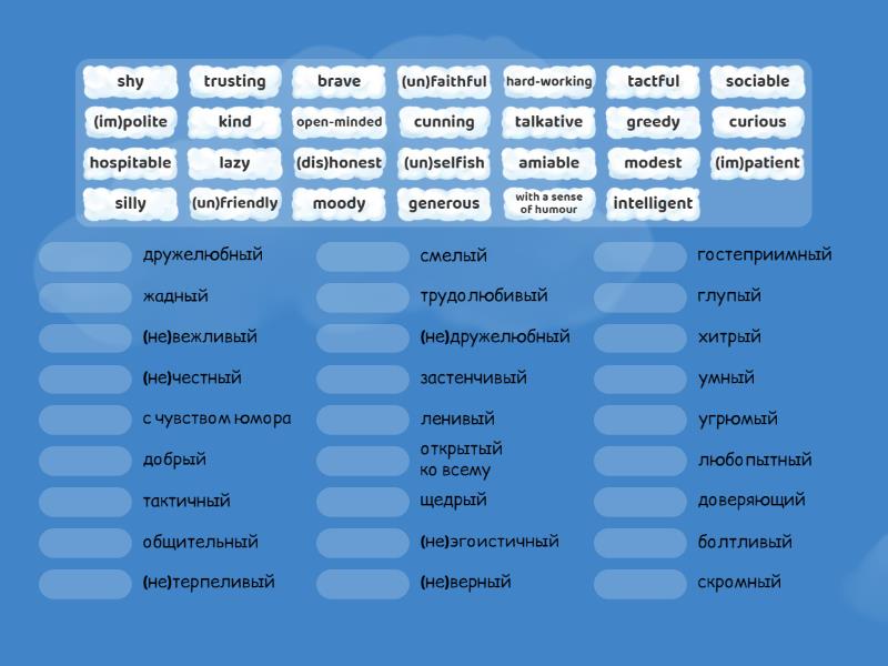 (un)faithful - (не)верный, (un)friendly - (не)дружелюбный, (un)selfish - (не)эгоистичный, amiable - дружелюбный, brave - смелый, cunning - хитрый, curious - любопытный, generous - щедрый, greedy - жадный, hard-working - трудолюбивый, with a sense of humour - с чувством юмора, hospitable - гостеприимный, intelligent - умный, kind - добрый, lazy - ленивый, moody - угрюмый, modest - скромный, open-minded - открытый ко всему, silly - глупый, sociable - общительный, tactful - тактичный, talkative - болтливый, trusting - доверяющий, (dis)honest - (не)честный, (im)patient - (не)терпеливый, (im)polite - (не)вежливый, shy - застенчивый,