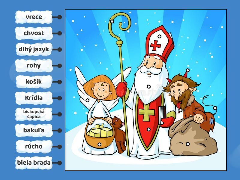 Krídla, košík, biskupská čapica, bakuľa, rúcho, biela brada, rohy, dlhý jazyk, vrece, chvost.