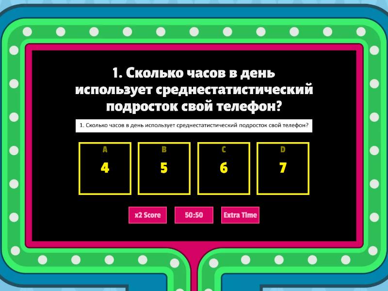 1) 1. Сколько часов в день использует среднестатистический подросток свой телефон? a) 4 b) 5 c) 6 d) 7 2) 2. Какой процент подростков используют интернет ежедневно? a) 98 b) 50 c) 63 d) 17 3) 3. Какой процент подростков используют интернет без контроля родителей? a) 90 b) 30 c) 57 d) 10 4) Самая популярная сеть у подростков по данным за 2021 год - это a) ВКонтакте b) Instagram c) Facebook d) YouTube 5) Чем занимаются дети в сети чаще всего? a) учатся b) играют c) проводят время в соцсетях d) создают что-то свое