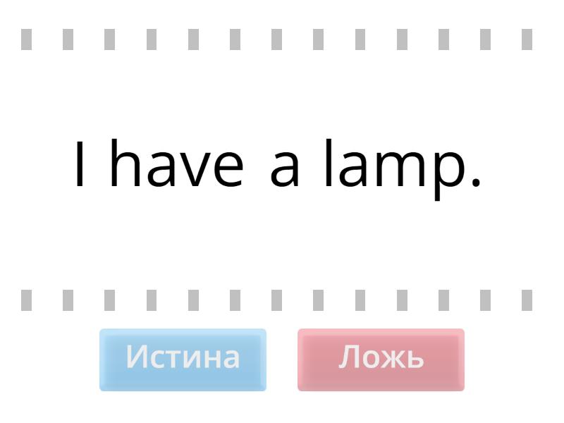 Истина: I have a lamp., He has a pig., She has a ball., She has no dog., I have dishes., She has a stick., He has a spoon., Ложь: I has a dog., He have a cat., She has a balls., He has no a dog., She has dishs., He has vasees., He has a spoons. ,