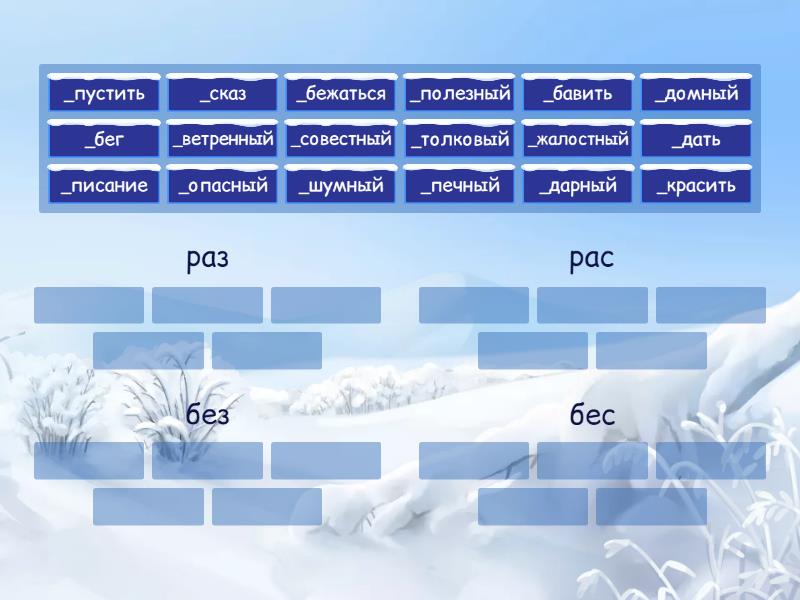 раз: _бежаться, _бег, _бавить, _дать, рас: _сказ, _писание, _пустить, _красить, без: _ветренный, _домный, _опасный, _дарный, _жалостный, бес: _шумный, _полезный, _толковый, _совестный, _печный,