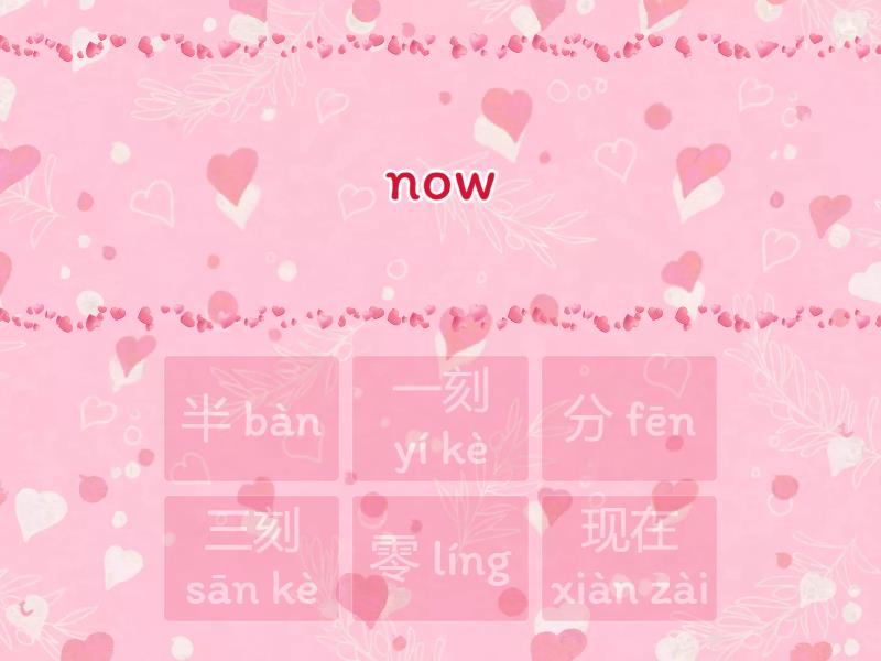 现在 xiàn zài - now, 分 fēn - minute, 一刻 yí kè - a quarter(of an hour), 三刻 sān kè - three quarters(of an hour), 半 bàn - half, 零 líng - zero,
