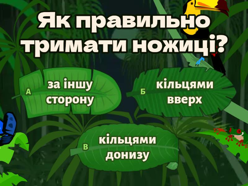 1) Як правильно тримати ножиці? a) за іншу сторону  b) кільцями вверх c) кільцями донизу 2) При роботі слідкувати за.... Вода – рідина при нагріванні  a) пальцями лівої руки b) пальцями правої руки 3) Передавай ножіці.... a) у закритому вигляді кільцями назад b) у закритому вигляді та кільцями вперед c) у відкритому вигляді  4) Не ріж ножицями... a) коли сидиш b) під час руху c) поряд з сусідом 5) Клей треба наносити... a) зверху вниз b) можна пальцями c) лише пензликом 6) Папіром користуйся .... a) обережно b) економно c) розходливо