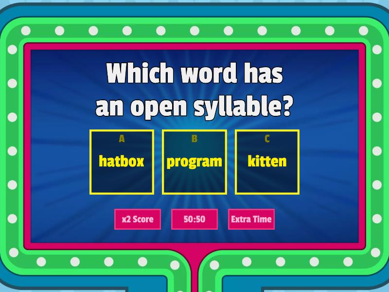 1) Which word has an open syllable?  a) hatbox b) program c) kitten 2) Which word has an open syllable? a) sinus b) swimmer c) packet 3) Which word has an open syllable? a) turtle b) rubber c) basic 4) Which word has an open syllable? a) ribbon b) fabric c) bacon 5) Which word has an open syllable? a) cupid b) exit c) puppet 6) Which word has a closed syllable? a) oval b) camel c) locate 7) Which word has a closed syllable? a) global b) welcome c) major 8) Which word has a closed syllable?  a) subject b) open c) donut 9) Which word has a closed syllable? a) chosen b) music c) rocket 10) Which word has a closed syllable? a) title b) silent c) magnet
