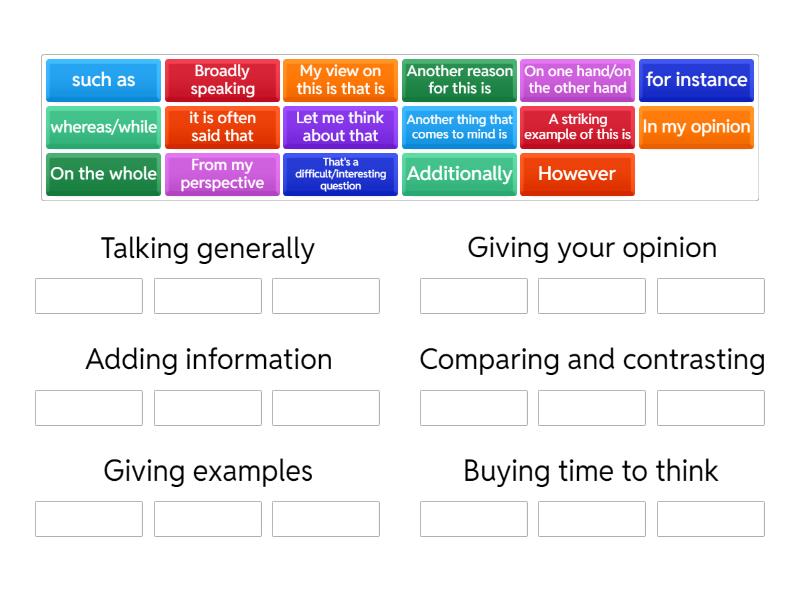 Talking generally: Broadly speaking , On the whole , it is often said that, Giving your opinion: In my opinion, From my perspective, My view on this is that is, Adding information: Another thing that comes to mind is, Additionally , Another reason for this is, Comparing and contrasting: However , On one hand/on the other hand , whereas/while, Giving examples: for instance, A striking example of this is, such as, Buying time to think: Let me think about that, That's a difficult/interesting question,