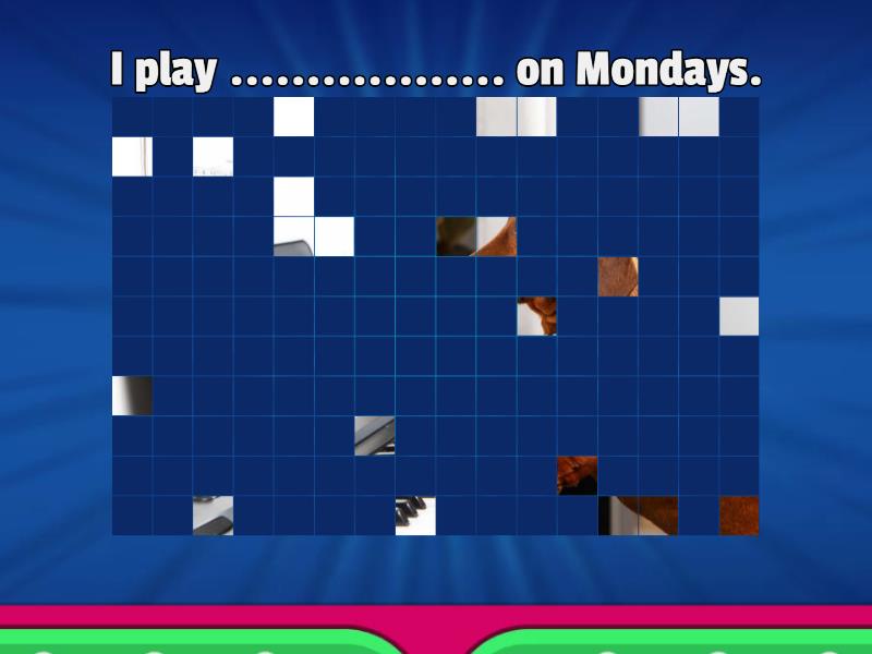 1) I play .................. on Mondays. a) the piano b) the violin c) the drums d) the guitar 2) My sister plays ..... at half past five every Friday. a) basketball b) baseball c) volleyball d) football 3) We go ............ on Sundays. a) running b) swimming c) jogging d) singing 4) He has ........ lessons on Mondays atten past four. a) piano b) dance c) French d) karate 5) My brother likes....... . a) singing b) drawing c) sleeping d) riding a bike 6) We like riding .... on Saturdays. a) bikes b) skates c) horses d) motorcycles 7) They go to a ...... class on Wednesdays. a) karate b) dance c) running  d) singing