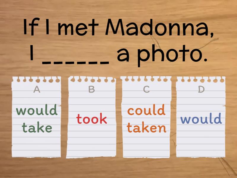 1) If I met Madonna, I ______ a photo. a) would take b) took c) could taken d) would 2) If I ______ in Japan, I would be really worried about earthquakes. a) 'd live b) lived c) live d) had lived 3) If I ______ you, I would help them. a) would be b) were c) be d) would been 4) If I ______ a stray dog, I would keep it as a pet. a) find b) found c) would find d) wouldn't find 5) If the weather were fine, we _____ a picnic. a) haven't b) had had c) had d) would have 6) I would try to get a job in a show business if I _______ well. a) can sing b) would sing c) could sing d) sung