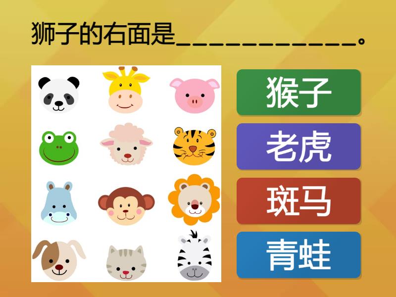 1) 羊的前面是___________。 a) 青蛙 b) 猴子 c) 老虎 d) 长颈鹿 2) 羊的后面是___________。 a) 青蛙 b) 猴子 c) 老虎 d) 长颈鹿 3) 羊的右面是___________。 a) 青蛙 b) 猴子 c) 老虎 d) 长颈鹿 4) 羊的左面是___________。 a) 青蛙 b) 猴子 c) 老虎 d) 长颈鹿 5) 猴子的前面是___________。 a) 羊 b) 猫 c) 狮子 d) 河马 6) 猴子的后面是___________。 a) 羊 b) 猫 c) 狮子 d) 河马 7) 猴子的右面是___________。 a) 羊 b) 猫 c) 狮子 d) 河马 8) 猴子的左面是___________。 a) 羊 b) 猫 c) 狮子 d) 河马 9) 狮子的前面是___________。 a) 猴子 b) 老虎 c) 斑马 d) 青蛙 10) 狮子的右面是___________。 a) 猴子 b) 老虎 c) 斑马 d) 青蛙 11) 狮子的后面是___________。 a) 猴子 b) 老虎 c) 斑马 d) 青蛙 12) 猫的右面是___________。 a) 狗 b) 猪 c) 斑马 d) 猴子