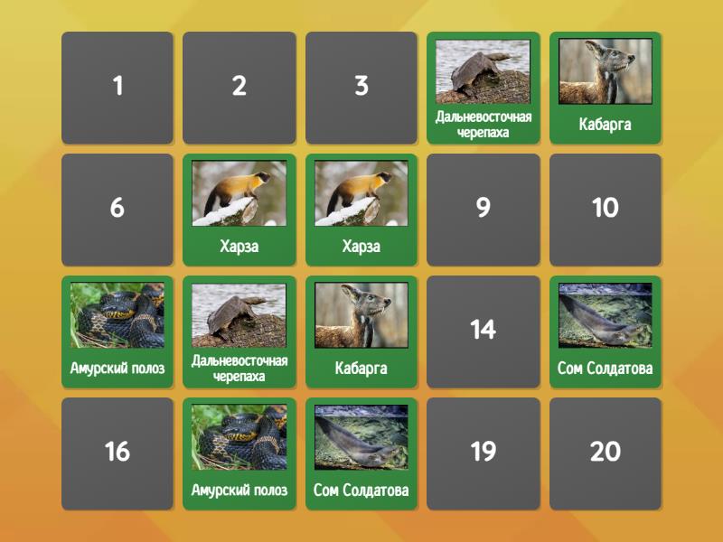 Кабарга, Сом Солдатова, Дальневосточная черепаха, Харза, Амурский полоз, Утка Мандаринка, Орлан-белохвост, Лотос Комарова, Амурский тигр, Уссурийский журавль,