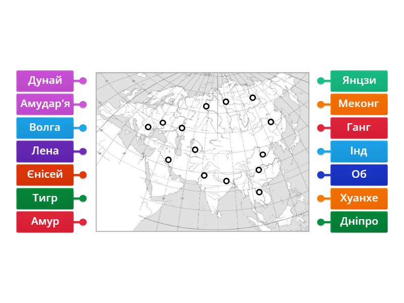 Інд, Ганг, Хуанхе, Дніпро, Дунай, Об, Янцзи, Єнісей, Лена, Волга, Амур, Меконг, Тигр, Амудар'я .