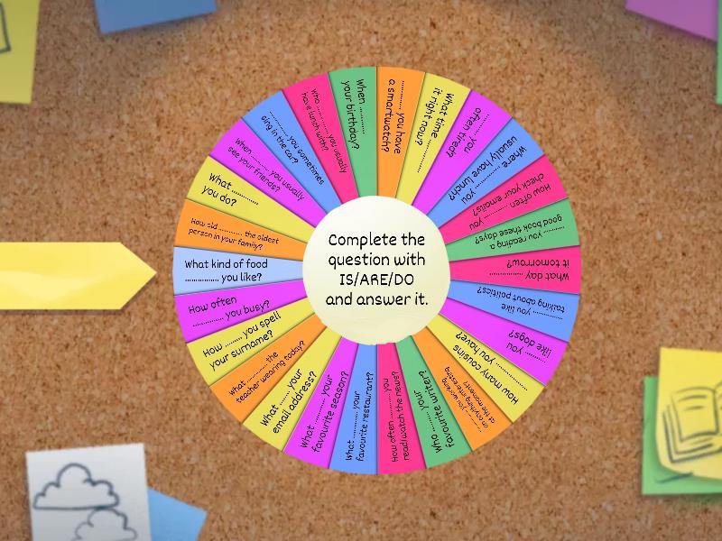 1) What ........ your email address? 2) How ......... you spell your surname? 3) Who .......... your favourite writer? 4) ........... you like dogs? 5) ............ you often tired? 6) Where ................ you usually have lunch? 7) What ............. your favourite season? 8) .............. you have a smartwatch? 9) How often ............... you busy? 10) What .............. you do? 11) What kind of food ................ you like? 12) How often .............. you check your emails? 13) When ............. your birthday? 14) ............ you reading a good book these days? 15) ................. you like talking about politics? 16) When .............. you usually see your friends? 17) What ............... your favourite restaurant? 18) How many cousins .................... you have? 19) What ................ the teacher wearing today? 20) What day ................ it tomorrow? 21) .................. you sometimes sing in the car? 22) Who .................. you usually have lunch with? 23) How often .............. you read/watch the news? 24) ................... you working on anything interesting at the moment? 25) What time ................. it right now? 26) How old ................ the oldest person in your family?