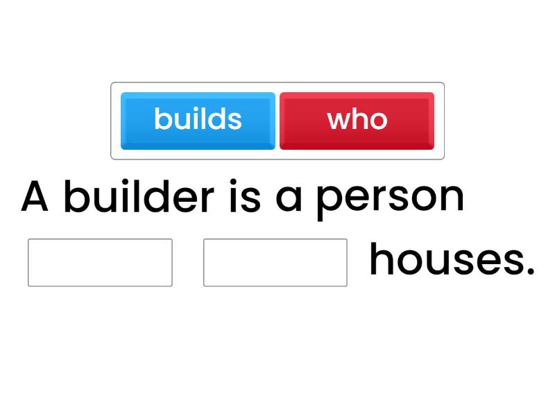A builder is a person ____ ____ houses. A hairdresser is somebody ____ ____ your hair. A library is a place ____ you can read or ____ books. A campsite is a place ____ people ____ in tents. A fridge is something ____ ____ food cold. A remote control is something ____ ____ TV channels. An architect is someone ____ ____ buildings. A cinema is a place ____ you can ____ a film. An art gallery is a place ____ you ____ paintings. Glasses are things ____ ____ you to see well. A bookshop is a place ____ you ____ books. A giraffe is an animal ____ ____ a very long neck. A key is something ____ ____ a door. A pilot is a person ____ ____ planes. A tourist is a person ____ ____ another town or country.