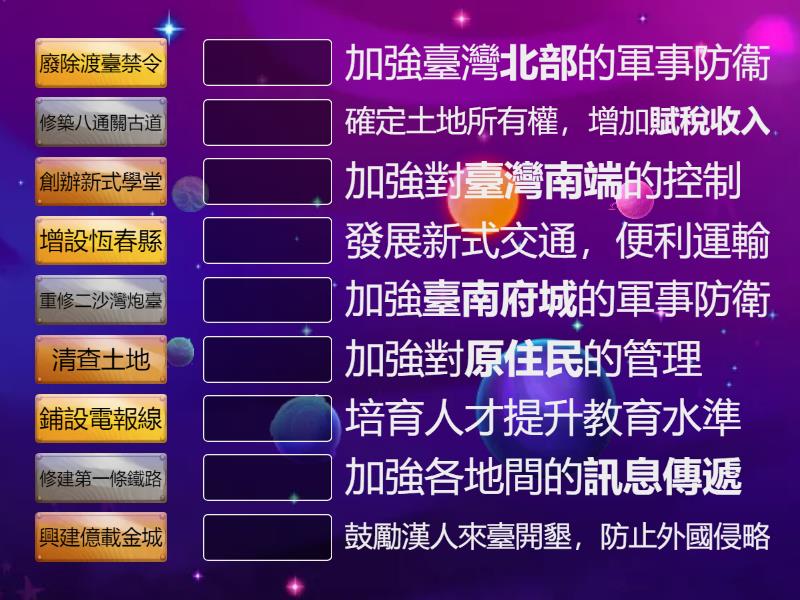 增設恆春縣 - 加強對臺灣南端的控制, 修築八通關古道 - 加強對原住民的管理, 清查土地 - 確定土地所有權,增加賦稅收入, 創辦新式學堂 - 培育人才提升教育水準, 修建第一條鐵路 - 發展新式交通,便利運輸, 興建億載金城 - 加強臺南府城的軍事防衛, 鋪設電報線 - 加強各地間的訊息傳遞, 廢除渡臺禁令 - 鼓勵漢人來臺開墾,防止外國侵略, 重修二沙灣炮臺 - 加強臺灣北部的軍事防衞,