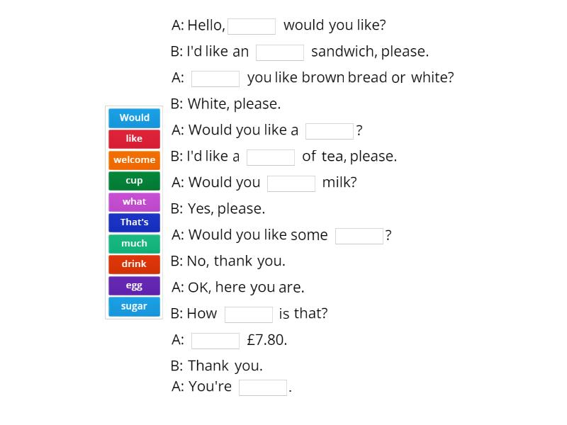 A: Hello,____ would you like? B: I'd like an ____ sandwich, please. A: ____ you like brown bread or white? B: White, please. A: Would you like a ____? B: I'd like a ____ of tea, please. A: Would you ____ milk? B: Yes, please. A: Would you like some ____? B: No, thank you. A: OK, here you are. B: How ____ is that? A: ____ £7.80. B: Thank you. A: You're ____.