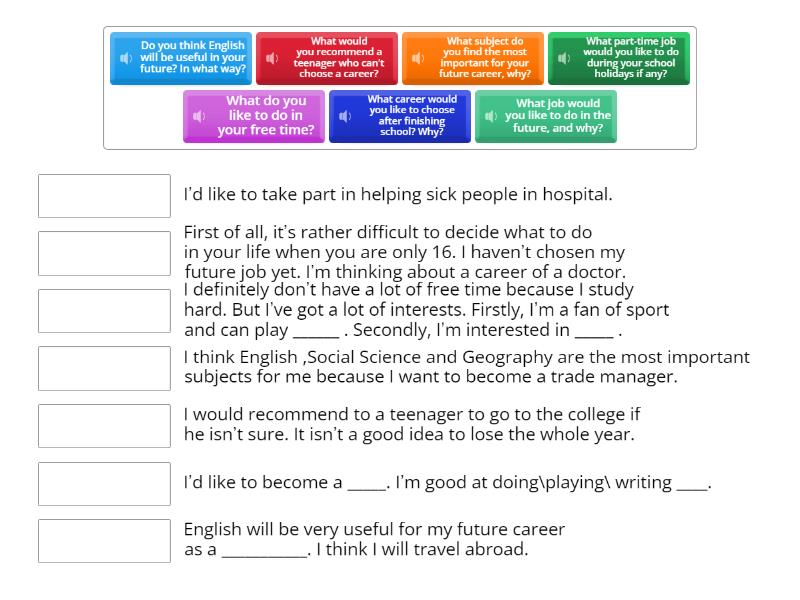What do you like to do in your free time? - I definitely don’t have a lot of free time because I study hard.  But I’ve got a lot of interests. Firstly, I’m a fan of sport and can play ______ . Secondly, I’m interested in _____ . , What part-time job would you like to do during your school holidays if any? - I’d like to take part in helping sick people in hospital., What career would you like to choose after finishing school? Why? - I’d like to become a _____. I’m good at doing\playing\ writing ____., Do you think English will be useful in your future? In what way? - English will be very useful for my future career as a ___________.  I think I will travel abroad., What job would you like to do in the future, and why? - First of all, it’s rather difficult to decide what to do in your life when you are only 16. I haven’t chosen my future job yet. I’m thinking about a career of a doctor., What subject do you find the most important for your future career, why? - I think English ,Social Science and Geography are the most important subjects for me because I want to become a trade manager., What would you recommend a teenager who can’t choose a career? - I would recommend to a teenager to go to the college if he isn’t sure. It isn’t a good idea to lose the whole year. ,