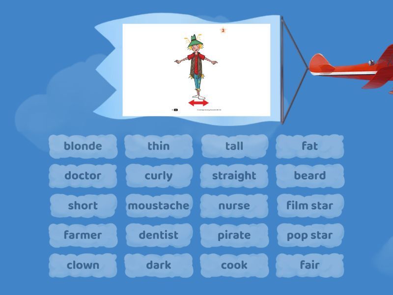 thin, tall, straight , blonde , short, fat, beard, moustache, fair , dark , curly , clown, cook, dentist, doctor, farmer, film star, nurse, pirate, pop star,