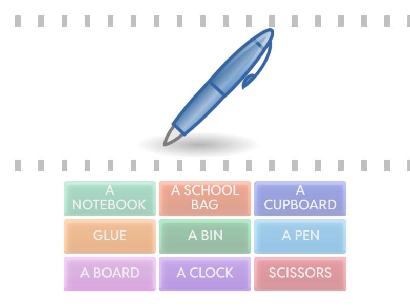 A PEN, SCISSORS, GLUE, A BIN, A BOARD, A CUPBOARD, A NOTEBOOK, A SCHOOL BAG, A CLOCK,