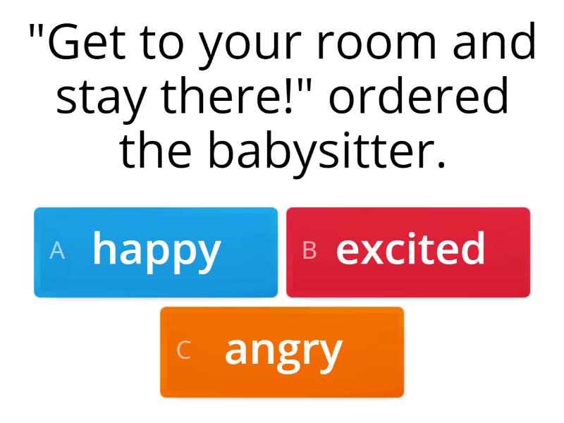 1) "Get to your room and stay there!" ordered the babysitter. a) happy b) excited c) angry 2) "We made it to the top of the mountain safety!" Peter rejoiced. a) horrified b) proud c) sad 3) "Where were you last night between the hours of 9:00 and 10:00pm?" interrogated the police. a) serious b) happy c) sad 4) "I don't want to go back to school tomorrow." mumbled Timmy. a) surprised b) excited c) upset 5) "Get me those pages by the end of the day or else!" ordered the boss. a) excited b) snippy c) giddy