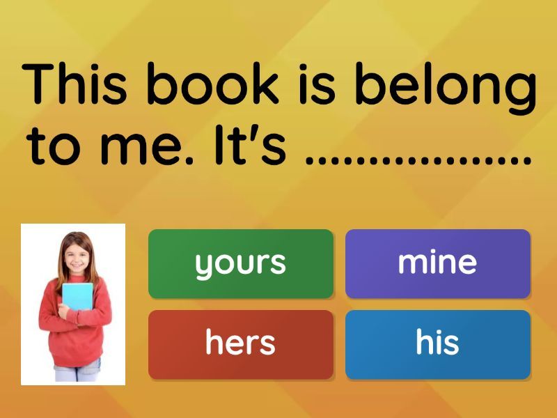1) This book is belong to me. It's .................. a) yours b) mine c) hers d) his 2) That is your cat. It's................ a) yours b) mine c) hers d) his 3) Those are Harith's socks. They're .......................... a) yours b) mine c) hers d) his 4) Those cupcakes are for you. They're ............... a) yours b) mine c) hers d) his 5) Lina bought a new school bag. It's ................ a) yours b) mine c) hers d) his 6) This is my bicycle. It's .................. a) yours b) mine c) hers d) his 7) Those are Susan's colours. They're................... a) yours b) mine c) hers d) his 8) This lego is for you. It's .................... a) yours b) mine c) hers d) his 9) Those are Ram's favourite toy cars.They're................... a) yours b) mine c) hers d) his 10) This is my laptop. It's.............................. a) yours b) mine c) hers d) his