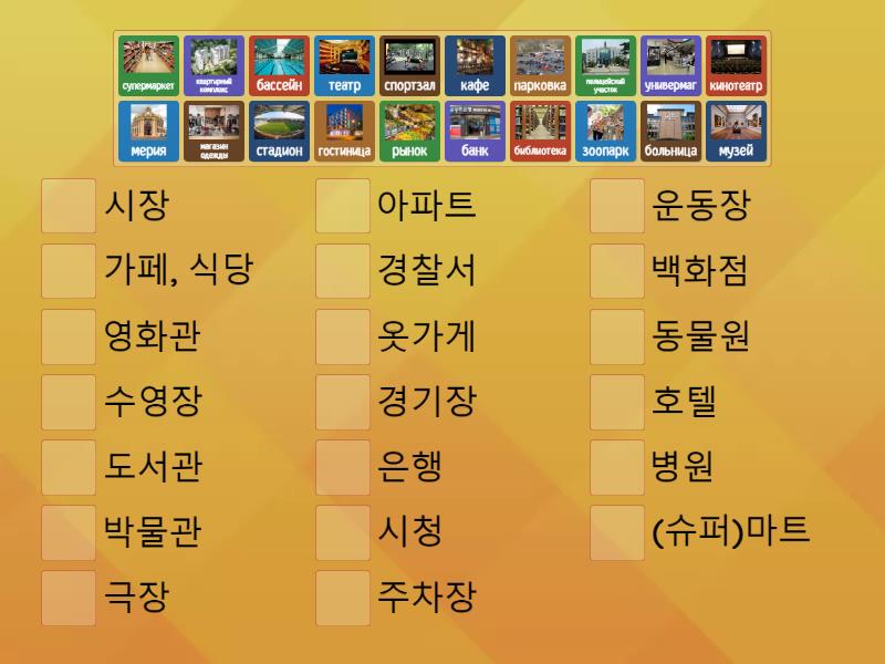 библиотека - 도서관, театр - 극장, спортзал - 운동장, мерия - 시청, бассейн - 수영장, гостиница - 호텔, музей - 박물관, универмаг - 백화점, зоопарк - 동물원, стадион - 경기장, квартирный комплекс - 아파트, рынок - 시장, полицейский участок - 경찰서, кафе - 가페, 식당, кинотеатр - 영화관, больница - 병원, магазин одежды - 옷가게, парковка - 주차장, супермаркет - (슈퍼)마트, банк - 은행,