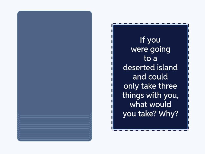 If you could travel back in time, where would you go?, If you were going to a deserted island and could only take three things with you, what would you take? Why?, If you could be a superhero, which one would you be and why?, If you could be invisible for a day, what would you do and why?, If you could speak any other language (besides English), what language would you like to speak?, If you were given 3 wishes, what would you wish for?, If you could change one thing in the world, what would it be?, If you saw a robbery, would you report it?, If you worked for a store and you saw another employee steal something, would you tell the manager?, If you could take a vacation anywhere in the world for any length of time, where would you go?, If you had to choose between love and no money or money and no love for the rest of your life, which would you choose?, If you could be an animal, what would you be?, If a classmate asked you for the answer to a question during an exam while the teacher was not looking, what would you do?, If you could date a celebrity, who would you choose?, If you could be another person for a day, who would you be?, If you could change one thing about yourself, what would it be?.