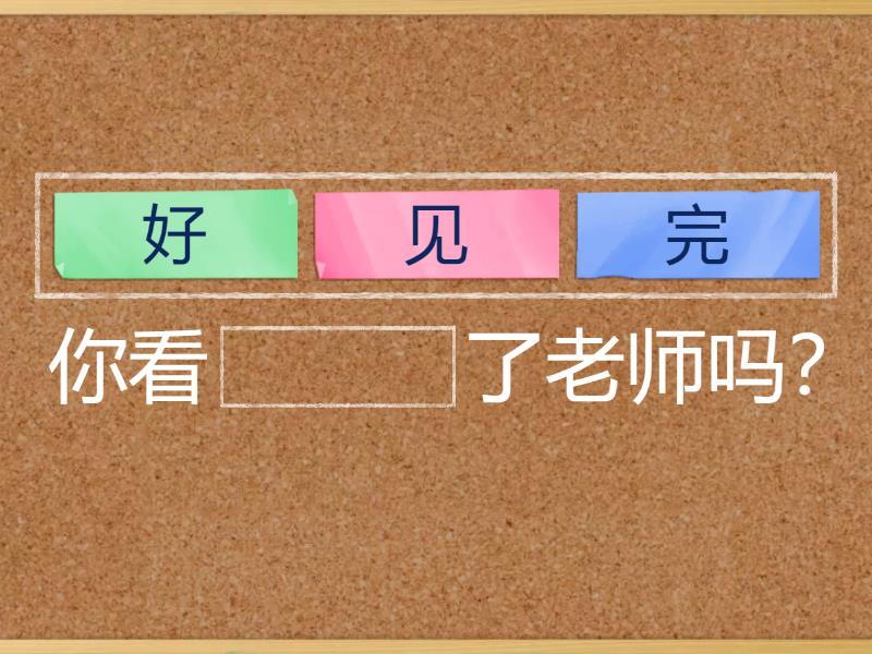 你看____了老师吗? 因为这个星期我没有睡____了,所以周末我想睡____十二点。 请别打扰我。 我做____饭了 他没吃____饭 你打____了电话 我找____了新的工作 1)我看____了这本书。 我写____了这个汉字。