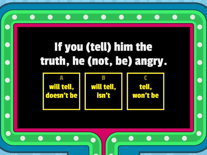 1) If I (go) to London, I (see) the Tower of London a) go, will see b) will go, see c) goes, sees 2) If it (rain), I (not, go) to the park. a) will rain, don't go b) rain, don't go c) rains, won't go 3) If I (have) enough money, I (buy) some new shoes. a) will have, buy b) have, will buy c) have, buy 4) She (miss) the bus if she (not, leave) soon. a) will miss, doesn't leave b) misses, won't leave c) will miss, don't leave 5) If I (study) today, I (go) to the party tonight. a) study, to go b) will study, go c) study, will go 6) If my friend (be) late, I (be) upset. a) is, will be b) will be, am c) be, am 7) If you (drop) that glass, it (break). a) will drop, breaks b) drop, break c) drop, will break 8) Your boss (be) angry if you (not, finish) the job. a) will be, don't finish b) is, won't finish c) is, doesn't finish 9) If you (eat) lots of ice-cream, you (have) a stomach-ache. a) eat, will have b) eat, had c) will eat, have 10) If she (not, go) to university, her parents (not, be) happy. a) won't go, are b) doesn't go, won't be c) not goes, aren't 11) If you (tell) him the truth, he (not, be) angry. a) will tell, doesn't be b) will tell, isn't c) tell, won't be