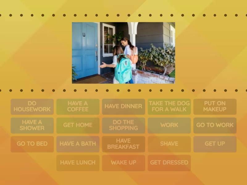 GET HOME , GET UP, GO TO BED , HAVE A SHOWER, HAVE BREAKFAST , HAVE DINNER , HAVE LUNCH , HAVE A COFFEE, DO HOUSEWORK , GET DRESSED , DO THE SHOPPING , PUT ON MAKEUP , GO TO WORK , SHAVE , TAKE THE DOG FOR A WALK , HAVE A BATH , WAKE UP, WORK,