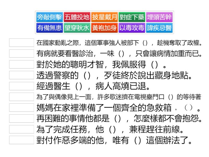望穿秋水 - 為了與偶像見上一面,許多歌迷擠在電視臺門口()的等待著, 披星戴月 - 為了完成任務,他(),兼程趕往前線。, 有備無患 - 媽媽在家裡準備了一個齊全的急救箱﹐()。, 埋頭苦幹 - 再困難的事情他都是(),怎麼樣都不會抱怨。, 旁敲側擊 - 透過警察的(),歹徒終於說出藏身地點。, 以毒攻毒 - 對付作惡多端的他,唯有()這個辦法了。, 五體投地 - 對於她的聰明才智,我佩服得()。, 對症下藥 - 經過醫生(),病人高燒已退。, 諱疾忌醫 - 有病就要看醫診治,一味(),只會讓病情加重而已。, 黃袍加身 - 在國家動亂之際,這個軍事強人被部下(),趁機奪取了政權。,