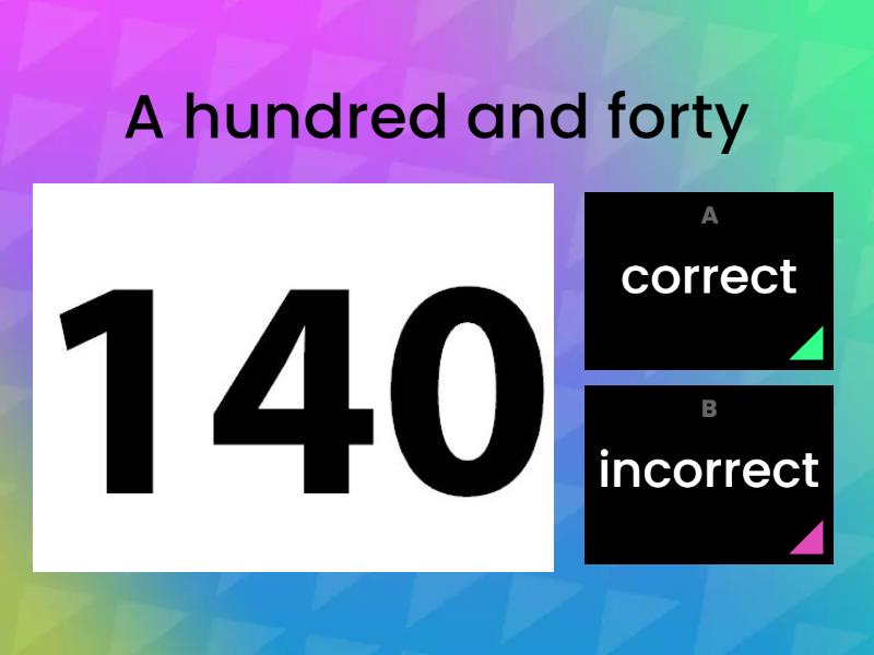 1) A hundred and forty a) correct b) incorrect 2) A thounsand eight hundred  a) correct b) incorrect 3) A thousand and fifty six a) correct b) incorrect 4) five millions a) correct b) incorrect 5) six million a) correct b) incorrect 6) four hundred and fifty six a) correct b) incorrect 7) 5,429 a) five thousand four hundred twenty-nine b) five thousand and four hundred and twenty-nine c) five thousand four hundred and twenty-nine 8) 5,012 a) five thousands and twelve b) five thousand and twelve c) five thousand twelve 9) 200,000 a) two hundred thousand b) two hundred and thousand c) two hundreds thousand 10) 965 a) nine hundred sixty-five b) nine hundreds and sixty five c) nine hundred and sixty-five 11) 2,300,000 a) two million three hundred thousand b) two millions three hundred thousand c) two million three hundred and thousand 12) 5, 670,000 a) five million six hundred seventy thousand b) five millions six hundreds and seventy thousand c) five million six hundred and seventy thousand