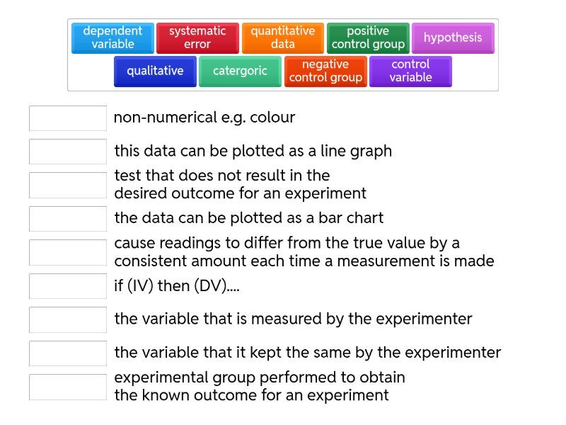 independent variable - the variable altered by the experimenter, dependent variable - the variable that is measured by the experimenter, control variable - the variable that it kept the same by the experimenter, control group - present exactly the same characteristics of the experimental group, except for the independent variable applied., positive control group - experimental group performed to obtain the known outcome for an experiment, negative control group - test that does not result in the desired outcome for an experiment, hypothesis - if (IV) then (DV)...., units - must be given for all quantitative variables, quantitative - numerical e.g. temperature, qualitative - non-numerical e.g. colour, catergoric - the data can be plotted as a bar chart, quantitative data - this data can be plotted as a line graph, validity - the extent to which the data you collect actually measures what you intended (are all extraneous variables controlled?), reliability - the degree to which repeated values under identical conditions will yield the same results, accuracy - How close is the data to the true / expected values, precision - How close the repeats for each IV value are together (range), systematic error - cause readings to differ from the true value by a consistent amount each time a measurement is made, random error - unpredictable variations in the measurement process and result in a spread of readings,