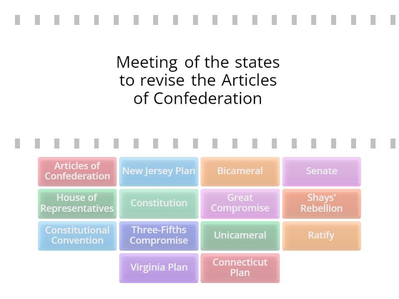 Constitutional Convention - Meeting of the states to revise the Articles of Confederation, Articles of Confederation - The original constitution of the United States, Bicameral - A legislature with two houses, Unicameral - A legislature with a single house, Great Compromise - The agreement to create a bicameral legislature, with the House having proportional representation and the Senate having equal representation, Three-Fifths Compromise - The agreement to count enslaved Africans as less than a single person for apportionment of representatives, Constitution - The basic laws of a nation that determine the powers of the government and guarantee certain rights to the people, Shays' Rebellion - An uprising by farmers in Western Massachusetts that convinced the founders to strengthen the central government, Virginia Plan - The plan favored by large states at the Convention that apportioned representatives to states in proportion to their population, New Jersey Plan - The plan favored by the small states at the Convention that gave each state an equal number of representatives, regardless of population, Connecticut Plan - The compromise plan that formed the basis of the Great Compromise, Ratify - To formally approve, House of Representatives - The house of Congress with proportional representation, Senate - The house of Congress with equal representation,