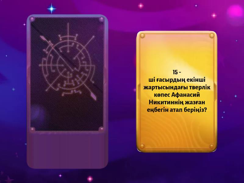 Географиялық зерттеу әдістері қаншаға бөлінеді?, Далалық әдістер қанашаға бөлінеді?, Экспедициялық зерттеуде көбінесе не зерттеледі?, Тау мұздықтардың жағдайын олардың таралуын мұздықтар шекарасын өзгеру себебін қандай экспедиция жетекшісі басқарды және қай жерді? , Қуаң даланың суландыру жүйесін қалыптастыру туралы қай экспедиция жетекшісі атап кетті?, Биік белдеулерде атмосфералық циркуляцияның жұмысын зерттеген экспедицияның есімі кім?, Компас дегеніміз не?, Батыс бағытта қанша градусты көрсетеді? Шығыс бағытында қанша градусты көрсетіп тұрады?, Оңтүстік қанша градус бағытын көрсетеді?, ГАЖ Географиялық ақпараттық жүйе дегеніміз не?, 1492 жылы Х. Колумб экспедициясы барысында ашылған аралдарды ата?, 15 - ші ғасырдың екінші жартысындағы тверлік көпес Афанасий Никитиннің жазған еңбегін атап беріңіз?, Ұлы географиялық ашулар кезеңін атаңыз?, Жаңа дүние бөлігін Вест - Индия деп атаған саяхатшы?, Орталық Азияны бірінші өтіп, Қашқарияны зерттеген ғалым? , Орта Азия мен Орталық Азияны зерттеген ғалым?, Қазақтың тұңғыш географ ғалымы?, Не үшін Тынық мұхиты деп атады?, Тынық мұхитын ашқан саяхатшы кім?, Алғашқы глобусты жасаған кім?, Веспучидің құрметіне "Америка" атағын берген кім еді?, Математикалық географияның негізін салған?, Х.Колумб өмірінің соңына дейін қандай жолды аштым деп ойлады?, Фернандо Магеллан Пиреней түбегінен алтын мен асыл тастарға көміліп жатқан Үндістанға баратын теңіз жолын ашу үшін үш кемемен аттанды үш кеменің аттарын атаңыз??, Колумб ең бірінші рет саяхат жасап зор еңбек сіңірседе Вест - Индия аралдардың арғы жағында жатқан зор материк ұлы теңіз саяхатшының атымен аталмады сонда кімнің атымен аталды?, Географияның Қайда деген сұрағына қай ғылым жауап береді? , Азимут бағыты дегеніміз не?, Қай ғасырда Ұлы географиялық ашулар кезеңі болды? , Масштаб дегеніміз не?, Атаулы масшатбты сандық масштабқа айналдырыңыз 1 см 50 м, 1 см 7 км, Сандық масштабты атаулы масштабқа айналдырыңыз 1: 4000, 1: 50 000, Мұхиттармен байланысты апаттар. Тропиктік циклондарға не жатады?, Тропиктік градус қандай градус аралықта байқалады?, Тропиктік циклондар туралы алғаш рет мәлімет қалдырған кім?, Қай елдерде қандай тропиктік циклондар болады?, Тайфун қай елдерде болады?, Вилли-вилли қай елде болады?, Торнадо деген не?, Долы дауыл деген не?, Тайфун деген не?, Цунами деген не?, Ғылымға «Биосфера» ұғымын алғаш рет (ХІХ ғасырда) қай француз ғалымы енгізді?, «Биосфера» ұғымын термин ретінде аустриялық геолог қай жылы енгізді және есімін атаңыз?, Биосфера дегеніміз не? Ережесін айтыңыз?, Биосфера туралы ілімді қай орыс ғалымы әзiрледі?, В.И.Вернадский биосфераны жанды және жансыз заттардың өзара әрекеттесуінің нәтижесінде жердің несінші қабаты деп атады?, Тірі организмдер бүкіл гидросфераны қанша км-ден астам тереңдікке дейін мекендейді?, Атмосфераның төменгі қабатында тірі ағзалар қанша км тереңдікке дейін тараған?, Литосфераның жоғары қабатын қанша км-ге дейін мекендейді?, Өмір сүру жағдайы қатаң жерлерде тіршілік аз. +50 °C-тан жоғары және –60 °C-тан төмен жерде, қоршаған ортада кімдер өмір сүреді?, Биосфера құрамына не кіреді?, Тірі затқа не жатады?, Биогенді затқа не жатады?, Биокосты затқа не жатады?, Топырақты қанша метр терең қазғанда топырақ қабаттары көрінеді?, Топырақ қанша жыл ішінде және қанша см топырақ қабаты пайда болады?, Атмосфера, литосфе