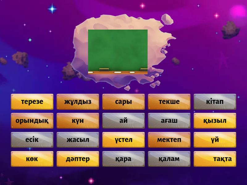 тақта, кітап, текше, дәптер, қалам, мектеп, терезе, есік, күн, үстел, ай, жұлдыз, үй, ағаш, орындық, қызыл, қара, сары, көк, жасыл,